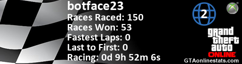 [URL=http://GTAonlinestats.com/showplayer/botface23/2][IMG]http://GTAonlinestats.com/racesignature/botface23/2/sig.png[/IMG][/URL]