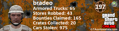 <a href="http://GTAonlinestats.com/showplayer/bradeo"><img src="http://GTAonlinestats.com/randomsignature/bradeo/sig.png" alt="bradeo" border="0" /></a>