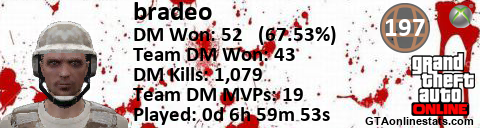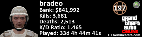 [URL=http://GTAonlinestats.com/showplayer/bradeo][IMG]http://GTAonlinestats.com/dmsignature/bradeo/sig.png[/IMG][/URL]