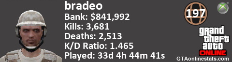 <a href="http://GTAonlinestats.com/showplayer/bradeo"><img src="http://GTAonlinestats.com/dmsignature/bradeo/sig.png" alt="bradeo" border="0" /></a>