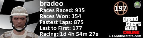 <a href="http://GTAonlinestats.com/showplayer/bradeo"><img src="http://GTAonlinestats.com/racesignature/bradeo/sig.png" alt="bradeo" border="0" /></a>