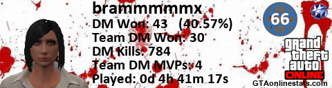 [URL=http://GTAonlinestats.com/showplayer/brammmmmx/2][IMG]http://GTAonlinestats.com/greysignature/brammmmmx/2/sig.png[/IMG][/URL]