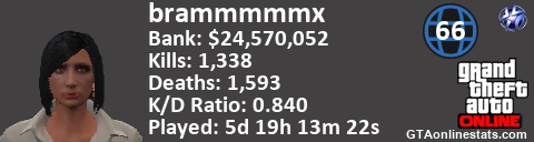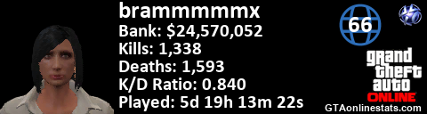 [URL=http://GTAonlinestats.com/showplayer/brammmmmx/2][IMG]http://GTAonlinestats.com/signature/brammmmmx/2/sig.png[/IMG][/URL]