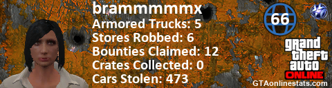 <a href="http://GTAonlinestats.com/showplayer/brammmmmx/2"><img src="http://GTAonlinestats.com/crimesignature/brammmmmx/2/sig.png" alt="brammmmmx" border="0" /></a>