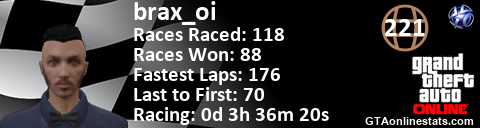 <a href="http://GTAonlinestats.com/showplayer/brax_oi"><img src="http://GTAonlinestats.com/racesignature/brax_oi/sig.png" alt="Brax_oi" border="0" /></a>