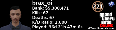<a href="http://GTAonlinestats.com/showplayer/brax_oi"><img src="http://GTAonlinestats.com/signature/brax_oi/sig.png" alt="Brax_oi" border="0" /></a>