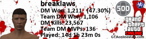 [URL=http://GTAonlinestats.com/showplayer/breaklaws][IMG]http://GTAonlinestats.com/signature/breaklaws/sig.png[/IMG][/URL]