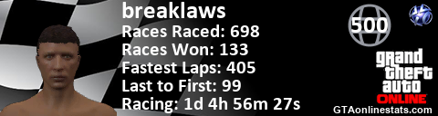 [URL=http://GTAonlinestats.com/showplayer/breaklaws][IMG]http://GTAonlinestats.com/racesignature/breaklaws/sig.png[/IMG][/URL]