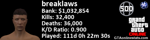 <a href="http://GTAonlinestats.com/showplayer/breaklaws"><img src="http://GTAonlinestats.com/randomsignature/breaklaws/sig.png" alt="BreakLaws" border="0" /></a>