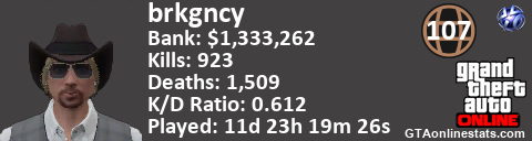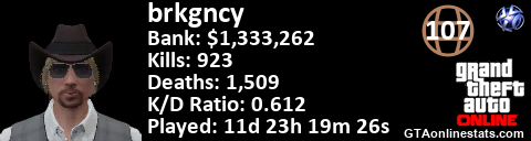 <a href="http://GTAonlinestats.com/showplayer/brkgncy"><img src="http://GTAonlinestats.com/randomsignature/brkgncy/sig.png" alt="BrkGncy" border="0" /></a>