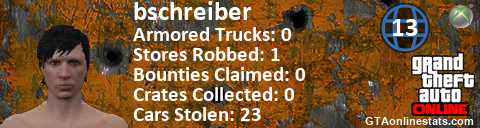 [URL=http://GTAonlinestats.com/showplayer/bschreiber/2][IMG]http://GTAonlinestats.com/crimesignature/bschreiber/2/sig.png[/IMG][/URL]