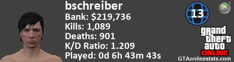 <a href="http://GTAonlinestats.com/showplayer/bschreiber/2"><img src="http://GTAonlinestats.com/signature/bschreiber/2/sig.png" alt="bschreiber" border="0" /></a>