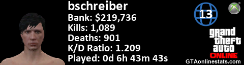 <a href="http://GTAonlinestats.com/showplayer/bschreiber/2"><img src="http://GTAonlinestats.com/randomsignature/bschreiber/2/sig.png" alt="bschreiber" border="0" /></a>