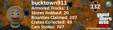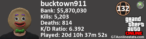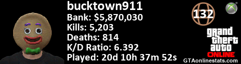 <a href="http://GTAonlinestats.com/showplayer/bucktown911"><img src="http://GTAonlinestats.com/randomsignature/bucktown911/sig.png" alt="bucktown911" border="0" /></a>