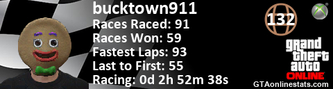 [URL=http://GTAonlinestats.com/showplayer/bucktown911][IMG]http://GTAonlinestats.com/racesignature/bucktown911/sig.png[/IMG][/URL]
