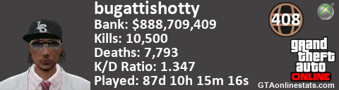 <a href="http://GTAonlinestats.com/showplayer/bugattishotty"><img src="http://GTAonlinestats.com/dmsignature/bugattishotty/sig.png" alt="bugattishotty" border="0" /></a>