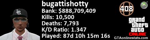 [URL=http://GTAonlinestats.com/showplayer/bugattishotty][IMG]http://GTAonlinestats.com/signature/bugattishotty/sig.png[/IMG][/URL]