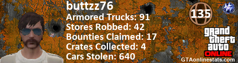 [URL=http://GTAonlinestats.com/showplayer/buttzz76/2][IMG]http://GTAonlinestats.com/crimesignature/buttzz76/2/sig.png[/IMG][/URL]