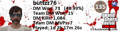 [URL=http://GTAonlinestats.com/showplayer/buttzz76/2][IMG]http://GTAonlinestats.com/dmsignature/buttzz76/2/sig.png[/IMG][/URL]
