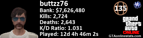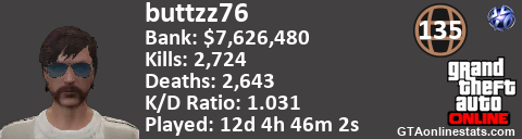 [URL=http://GTAonlinestats.com/showplayer/buttzz76/2][IMG]http://GTAonlinestats.com/signature/buttzz76/2/sig.png[/IMG][/URL]