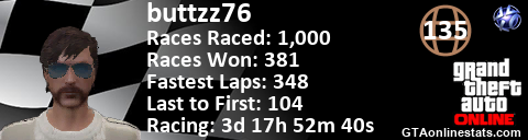 <a href="http://GTAonlinestats.com/showplayer/buttzz76/2"><img src="http://GTAonlinestats.com/racesignature/buttzz76/2/sig.png" alt="buttzz76" border="0" /></a>
