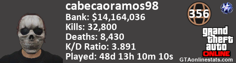 <a href="http://GTAonlinestats.com/showplayer/cabecaoramos98"><img src="http://GTAonlinestats.com/randomsignature/cabecaoramos98/sig.png" alt="cabecaoramos98" border="0" /></a>