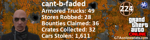 [URL=http://GTAonlinestats.com/showplayer/cant-b-faded][IMG]http://GTAonlinestats.com/signature/cant-b-faded/sig.png[/IMG][/URL]