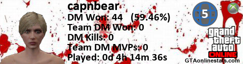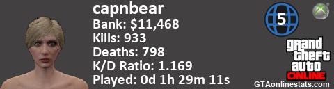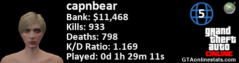 [URL=http://GTAonlinestats.com/showplayer/capnbear/2][IMG]http://GTAonlinestats.com/signature/capnbear/2/sig.png[/IMG][/URL]