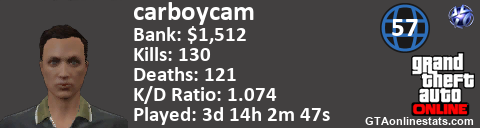 [URL=http://GTAonlinestats.com/showplayer/carboycam][IMG]http://GTAonlinestats.com/dmsignature/carboycam/sig.png[/IMG][/URL]