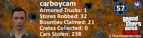[URL=http://GTAonlinestats.com/showplayer/carboycam][IMG]http://GTAonlinestats.com/crimesignature/carboycam/sig.png[/IMG][/URL]