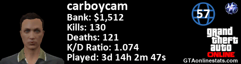 [URL=http://GTAonlinestats.com/showplayer/carboycam][IMG]http://GTAonlinestats.com/randomsignature/carboycam/sig.png[/IMG][/URL]