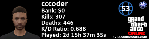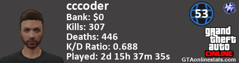 <a href="http://GTAonlinestats.com/showplayer/cccoder"><img src="http://GTAonlinestats.com/randomsignature/cccoder/sig.png" alt="CCCoder" border="0" /></a>