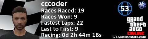 <a href="http://GTAonlinestats.com/showplayer/cccoder"><img src="http://GTAonlinestats.com/racesignature/cccoder/sig.png" alt="CCCoder" border="0" /></a>