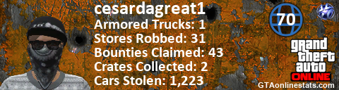 [URL=http://GTAonlinestats.com/showplayer/cesardagreat1][IMG]http://GTAonlinestats.com/crimesignature/cesardagreat1/sig.png[/IMG][/URL]