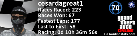 [URL=http://GTAonlinestats.com/showplayer/cesardagreat1][IMG]http://GTAonlinestats.com/racesignature/cesardagreat1/sig.png[/IMG][/URL]