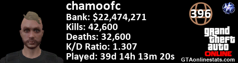 <a href="http://GTAonlinestats.com/showplayer/chamoofc"><img src="http://GTAonlinestats.com/signature/chamoofc/sig.png" alt="chamoofc" border="0" /></a>
