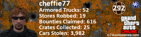 <a href="http://GTAonlinestats.com/showplayer/cheffie77"><img src="http://GTAonlinestats.com/randomsignature/cheffie77/sig.png" alt="cheffie77" border="0" /></a>