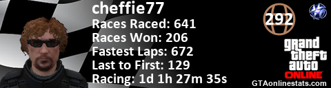 <a href="http://GTAonlinestats.com/showplayer/cheffie77"><img src="http://GTAonlinestats.com/racesignature/cheffie77/sig.png" alt="cheffie77" border="0" /></a>