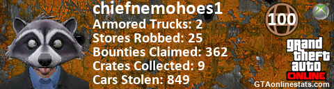 <a href="http://GTAonlinestats.com/showplayer/chiefnemohoes1"><img src="http://GTAonlinestats.com/randomsignature/chiefnemohoes1/sig.png" alt="chiefnemohoes1" border="0" /></a>
