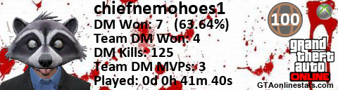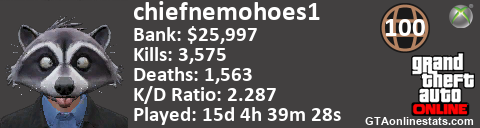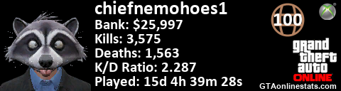 [URL=http://GTAonlinestats.com/showplayer/chiefnemohoes1][IMG]http://GTAonlinestats.com/randomsignature/chiefnemohoes1/sig.png[/IMG][/URL]