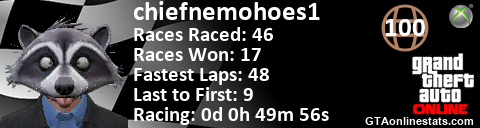 <a href="http://GTAonlinestats.com/showplayer/chiefnemohoes1"><img src="http://GTAonlinestats.com/racesignature/chiefnemohoes1/sig.png" alt="chiefnemohoes1" border="0" /></a>