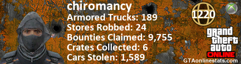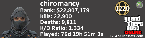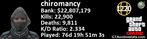 <a href="http://GTAonlinestats.com/showplayer/chiromancy"><img src="http://GTAonlinestats.com/randomsignature/chiromancy/sig.png" alt="Chiromancy" border="0" /></a>