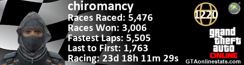 [URL=http://GTAonlinestats.com/showplayer/chiromancy][IMG]http://GTAonlinestats.com/racesignature/chiromancy/sig.png[/IMG][/URL]