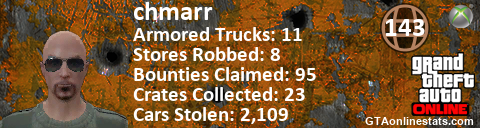 [URL=http://GTAonlinestats.com/showplayer/chmarr][IMG]http://GTAonlinestats.com/signature/chmarr/sig.png[/IMG][/URL]