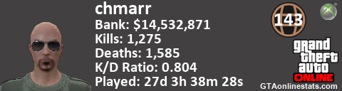 <a href="http://GTAonlinestats.com/showplayer/chmarr"><img src="http://GTAonlinestats.com/signature/chmarr/sig.png" alt="chmarr" border="0" /></a>