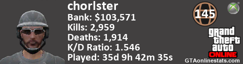 <a href="http://GTAonlinestats.com/showplayer/chorlster"><img src="http://GTAonlinestats.com/signature/chorlster/sig.png" alt="Chorlster" border="0" /></a>