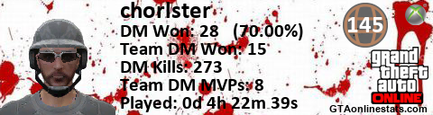 [URL=http://GTAonlinestats.com/showplayer/chorlster][IMG]http://GTAonlinestats.com/dmsignature/chorlster/sig.png[/IMG][/URL]