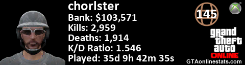 <a href="http://GTAonlinestats.com/showplayer/chorlster"><img src="http://GTAonlinestats.com/crimesignature/chorlster/sig.png" alt="Chorlster" border="0" /></a>