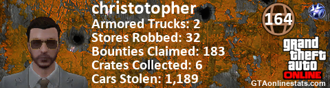 [URL=http://GTAonlinestats.com/showplayer/christotopher][IMG]http://GTAonlinestats.com/crimesignature/christotopher/sig.png[/IMG][/URL]