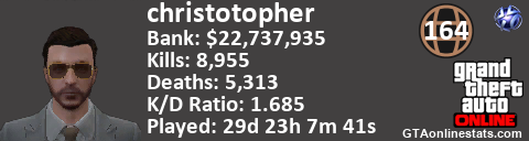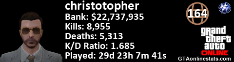 [URL=http://GTAonlinestats.com/showplayer/christotopher][IMG]http://GTAonlinestats.com/dmsignature/christotopher/sig.png[/IMG][/URL]